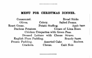 - You can’t celebrate the holidays without food, and turn of the century Phoenicians weren’t ones to shy from that kind of party! Holiday dinners were special, and so, were more extravagant. If they could afford to, people would go to a restaurant for their holiday meal. The Hotel Adams, the Ford Hotel, Hotel Hardwick, and the Opera House Café all listed their menus in the December 25, 1896 edition of the newspaper. Like the Christmas dinner menu pictured here from the 1896 Fanny Farmer Cookbook, these menus listed anywhere from six to eight different courses, and include caviar, oysters, consommé, green turtle soup, lobster bisque, olives, halibut, roasts, turkey, venison, quail, duck, potatoes, asparagus, cauliflower, peas, tomatoes, waffles, puddings, sweetbreads, pies, ice cream, lady fingers, macaroons, fruit, walnuts, almonds, candied raisins, cheese, crackers, and coffee. The courses were small, but that is still a lot of food!